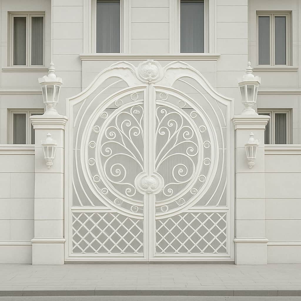 | طراحی ظاهری درب فلزی دایره مصور | طراحی ظاهری درب فلزی دایره مصور بر پایه یک دایره سه بعدی مرکزی, حلقه های تزئینی و خطوط منحنی نرم شکل گرفته است که در نمای ویلا و باغ جلوه ای کاملاً متفاوت نسبت به درب های ساده ایجاد می کند و در عین حال با قاب بندی دقیق و تقسیم بندی بصری, تناسب مناسبی میان بخش دایره ای, اطراف آن و ستون های کناری برقرار می شود. |