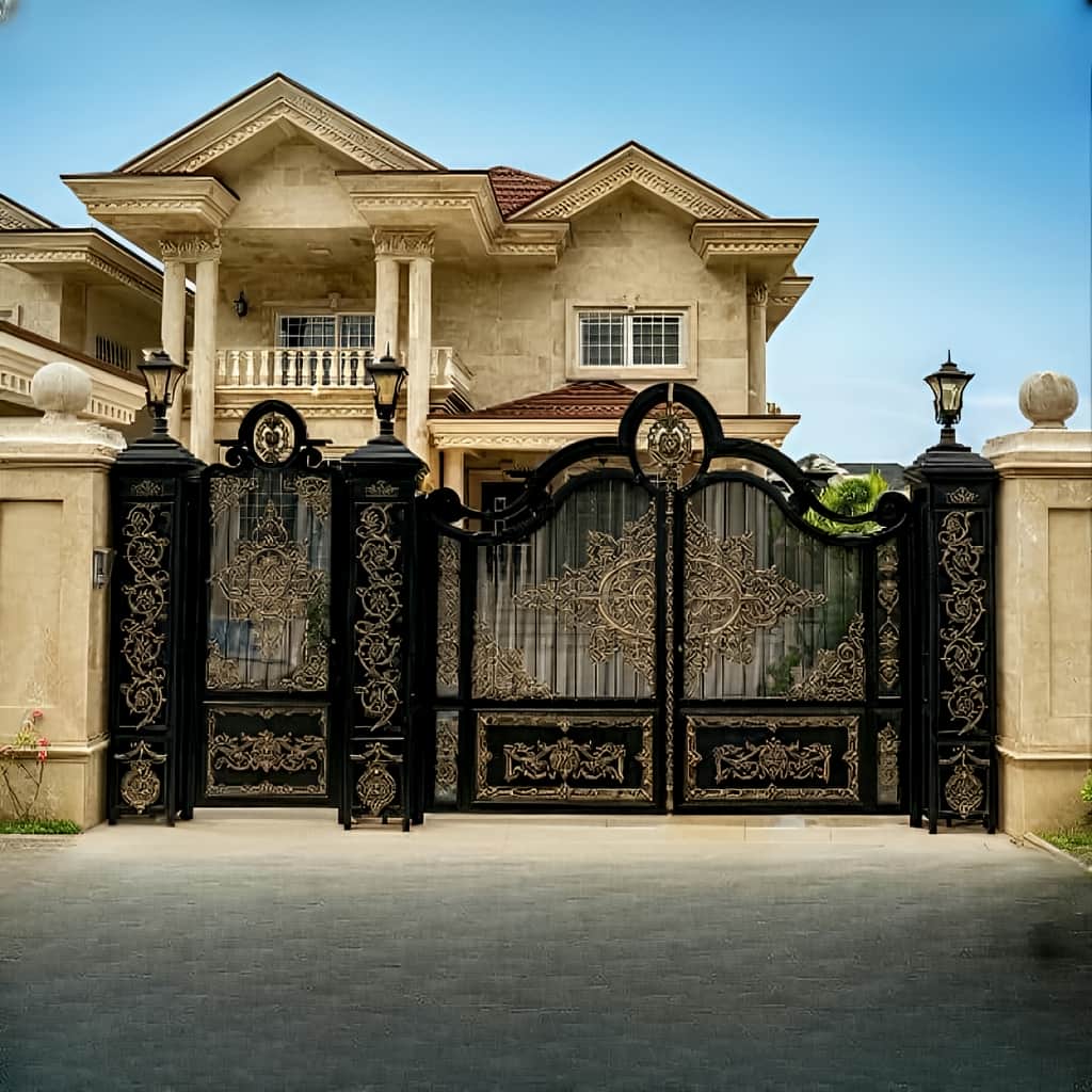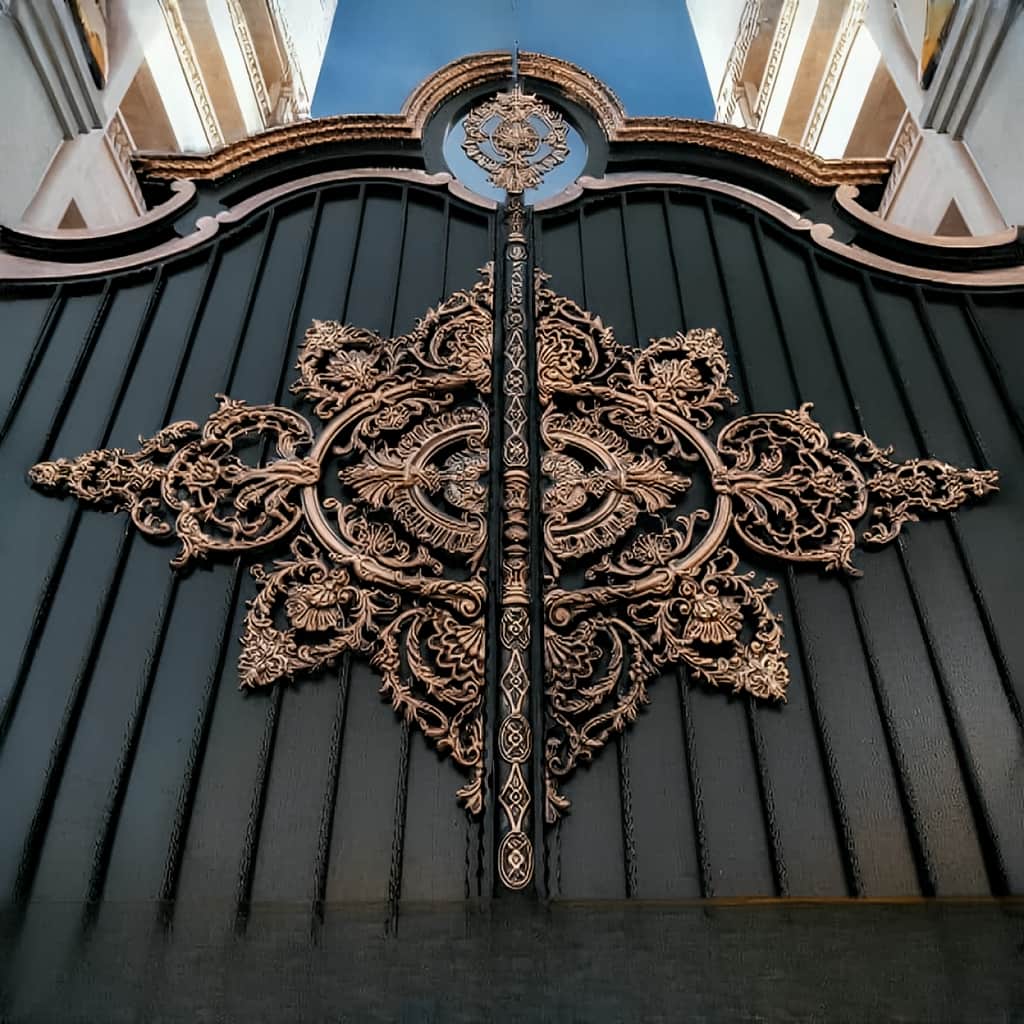 - طراحی کلاسیک درب فلزی گل آرا با تاج گل دار و شاخه های منحنی, برای نماهای سنگی رومی و ویلای لوکس هماهنگی ظاهری بالایی ایجاد می کند.